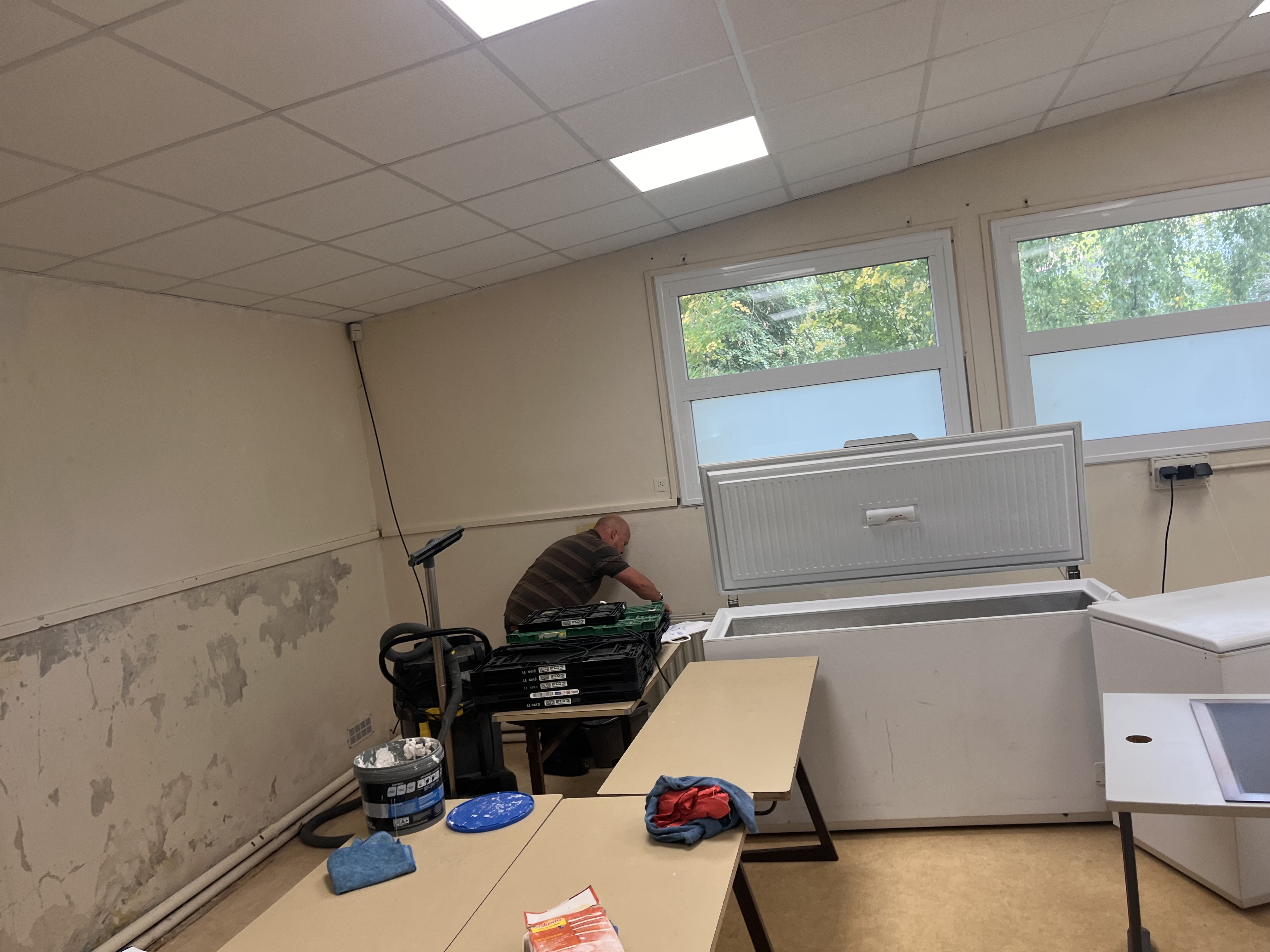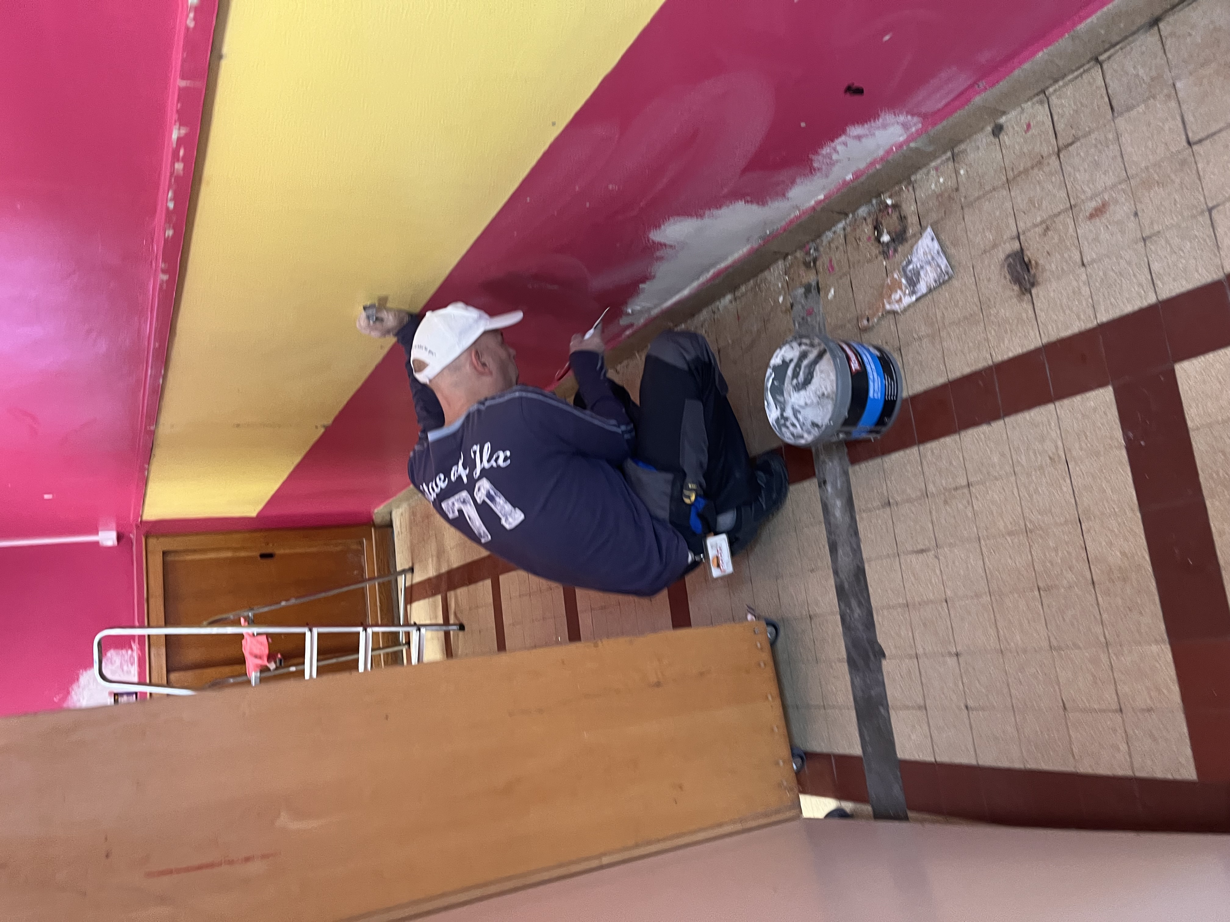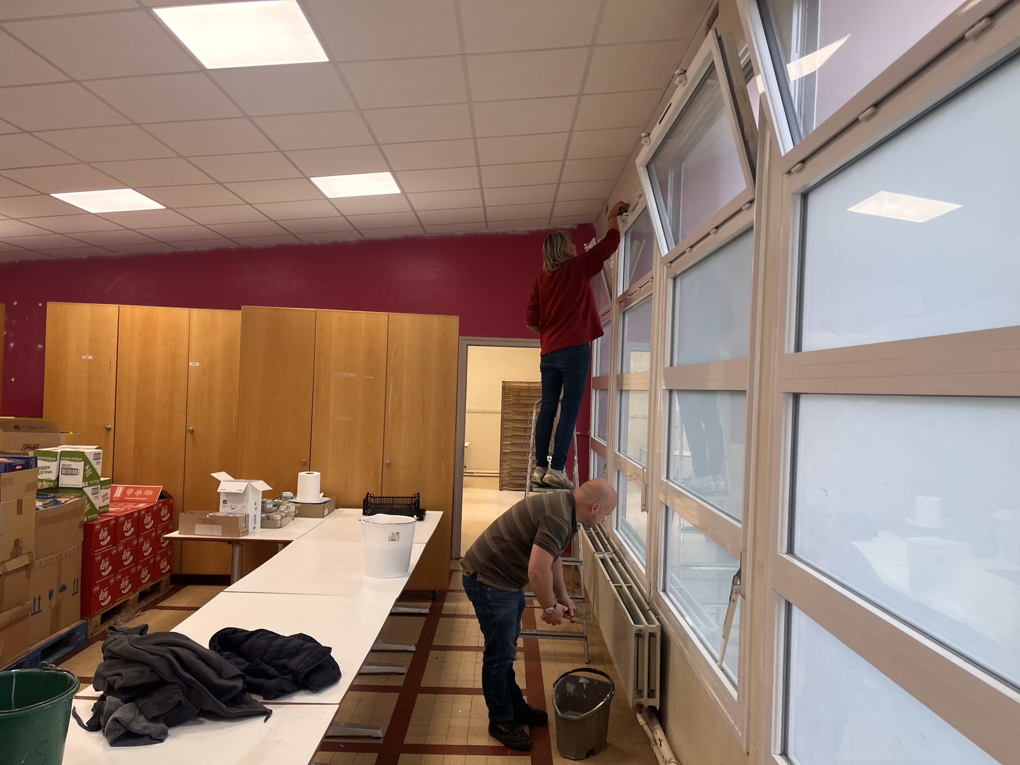 Grâce à l’engagement de cinq bénévoles des Bricos du Cœur ainsi que de bénévoles des Restos du Cœur, tous impliqués, dynamiques et consciencieux, le centre a été nettoyé et préparé pour la prochaine étape : l’application des peintures.